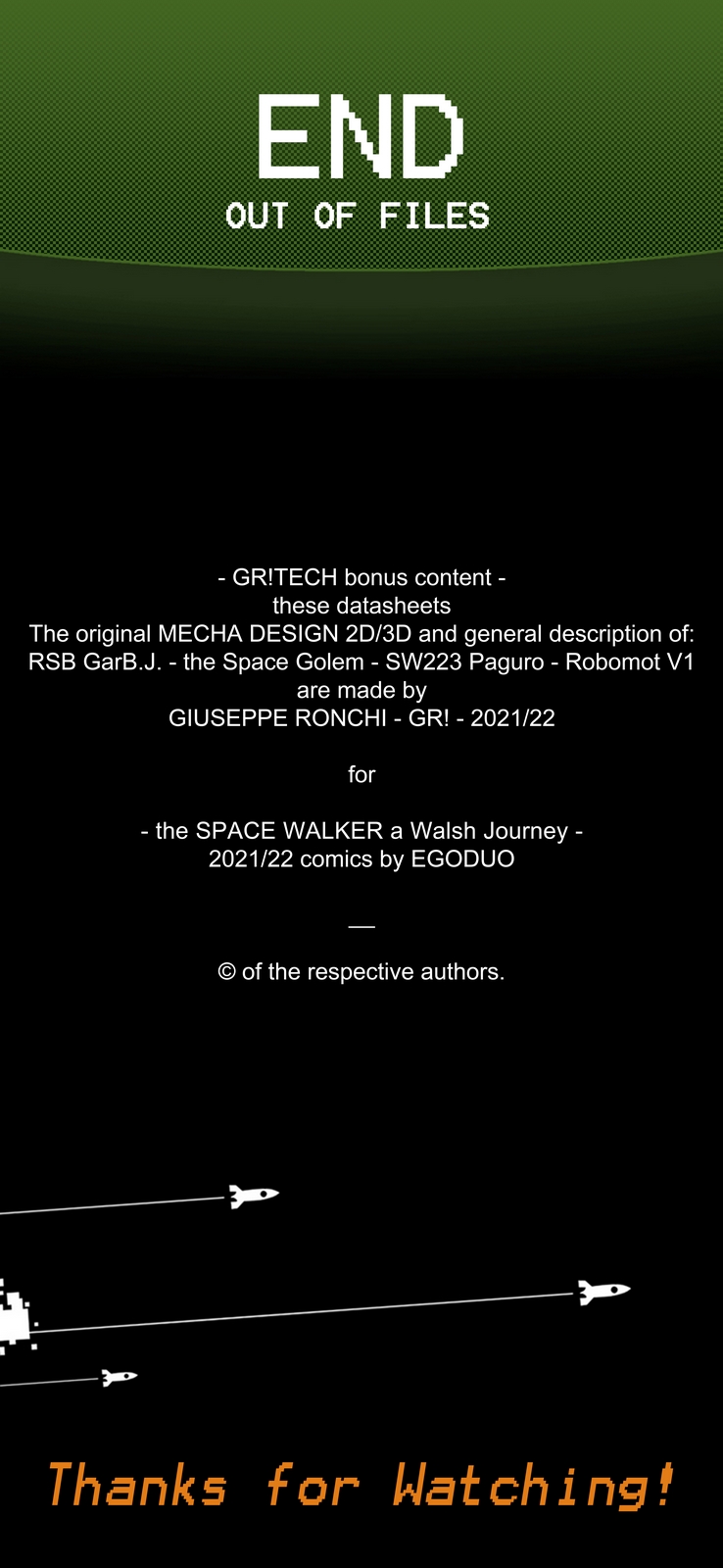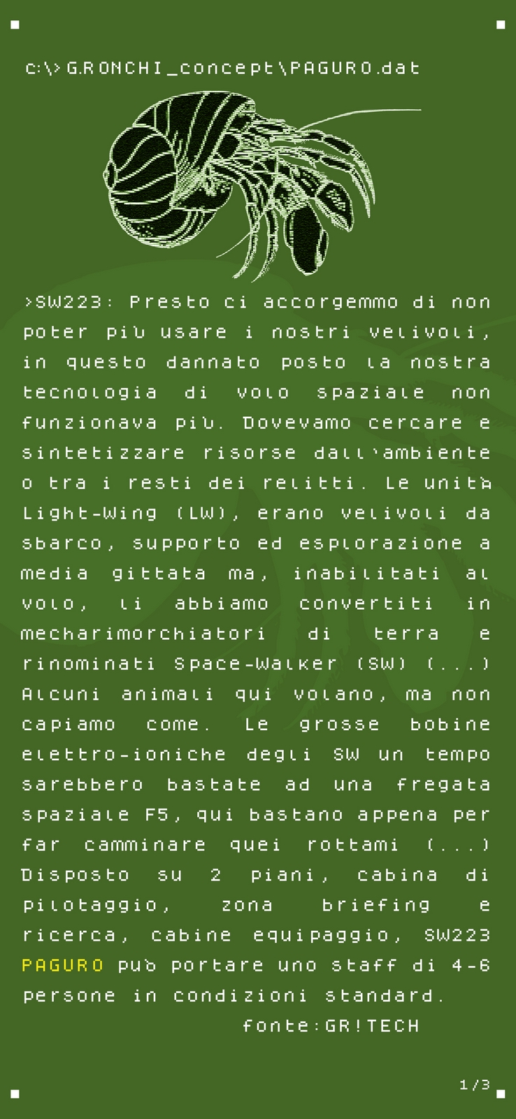 Questa raccolta di file "segreti" composti da testi e disegni, fanno parte dei concept originali realizzati da Giuseppe Ronchi alias GR! per questa strana avventura spaziale.